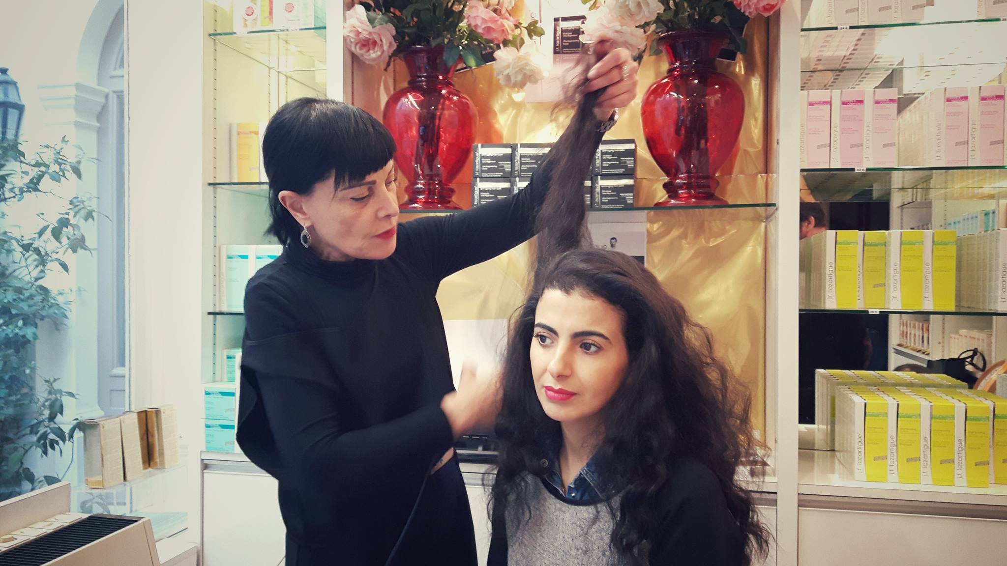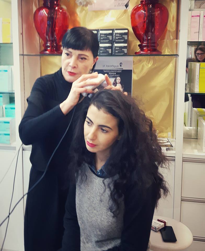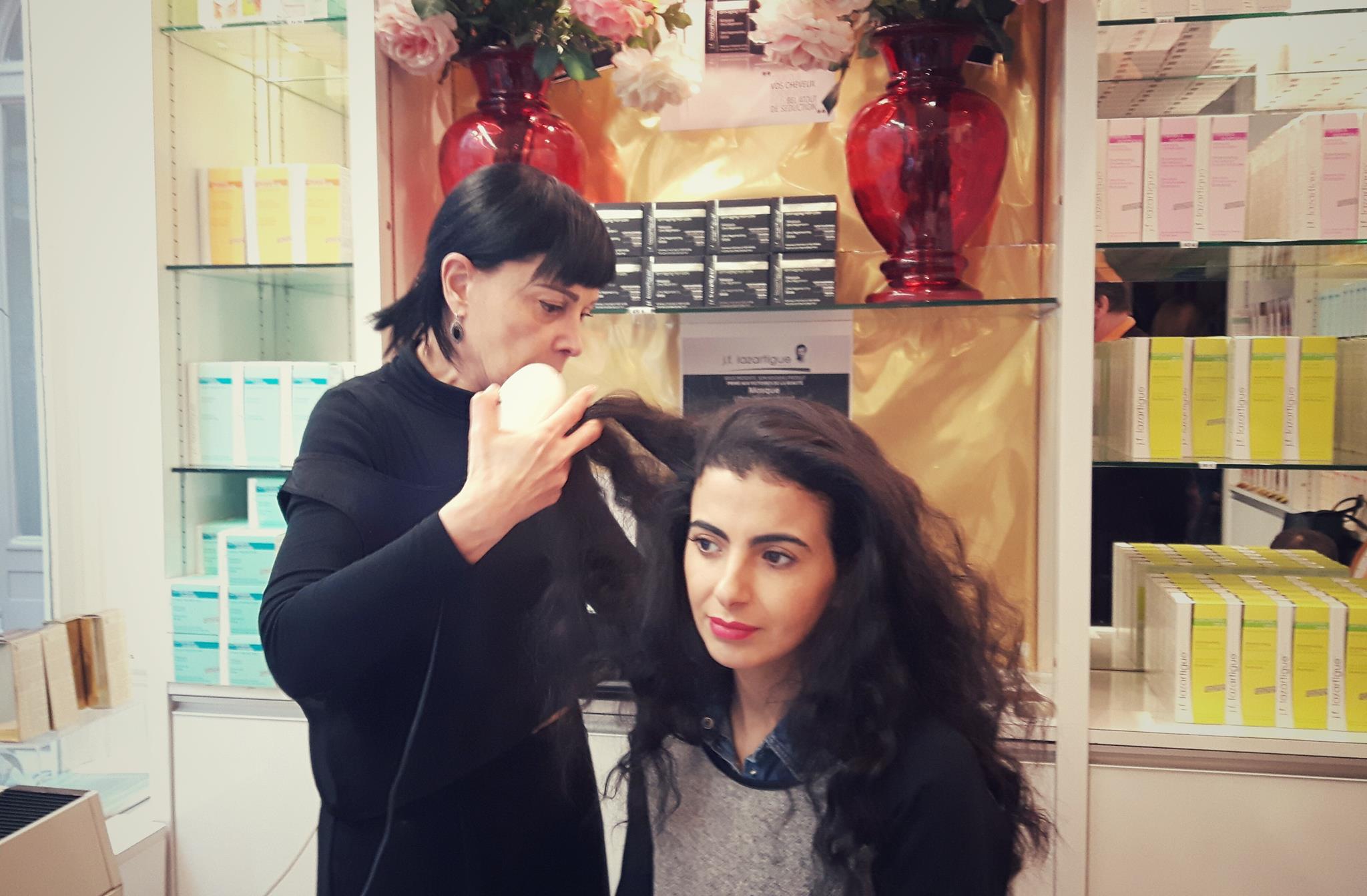 Je suis allée à la rencontre du spécialiste du soin des cheveux  pour un entretien et un diagnostic personnalisé. Je lui explique spontanément mes rituels capillaires : j’ai les cheveux longs, très secs de nature que je perds énormément surtout en ce moment probablement à cause d’une alimentation déséquilibrée et de la pollution. Je me sens très fatiguée et cela se reflète sur ma chevelure.