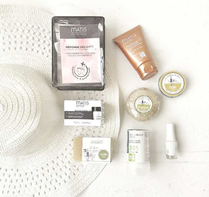 Mi-Août et certaines de mes copines sont rentrées bronzées et reposées et d’autres préparent leur valise pour terminer le mois en beauté. Je vous ai concocté une mini trousse beauté des essentielles à emporter avec soi, tout y est – une routine beauté visage Matis. Le Kit Voyage Réponse Délicate (crème démaquillante, lotion tilleul, crème de gommage, masque délicat, soin douceur hydratant), une crème Protection Solaire visage SPF 50, en 50 ml , toujours chez Matis et une boite de 4 flacons « Concentré Lift Express ». Un déodorant à la pierre d’alun Dermophil. Un vernis « coton » de la collection Good Nature par Innoxa. Et enfin cerise sur le gâteau, une sélection de la marque Les Savons de Joya: un shampoing solide et un baume lèvres et un savon au agrumes. C’est une marque de produits cosmétiques naturelles j’y consacre mon billet suivant tellement les produits sont topissime !